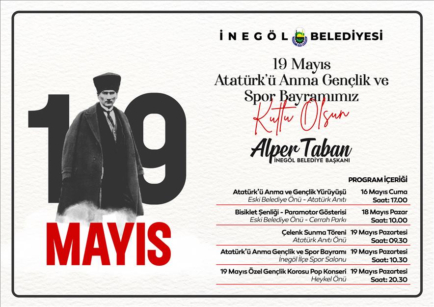 İnegöl Belediye Başkanı Alper Taban, tüm vatandaşları 16-19 Mayıs tarihleri arasında düzenlenecek etkinliklere katılmaya davet ederek şu mesajı verdi: "Gazi Mustafa Kemal Atatürk'ün gençliğe armağan ettiği bu anlamlı günü hep birlikte, coşku ve gururla kutlamak için tüm vatandaşlarımızı etkinliklerimize bekliyoruz. Bayraklarımız ve sevdiklerimizle birlikte bu güzel bayramı İnegöl'ün dört bir yanında hep birlikte kutlayalım."