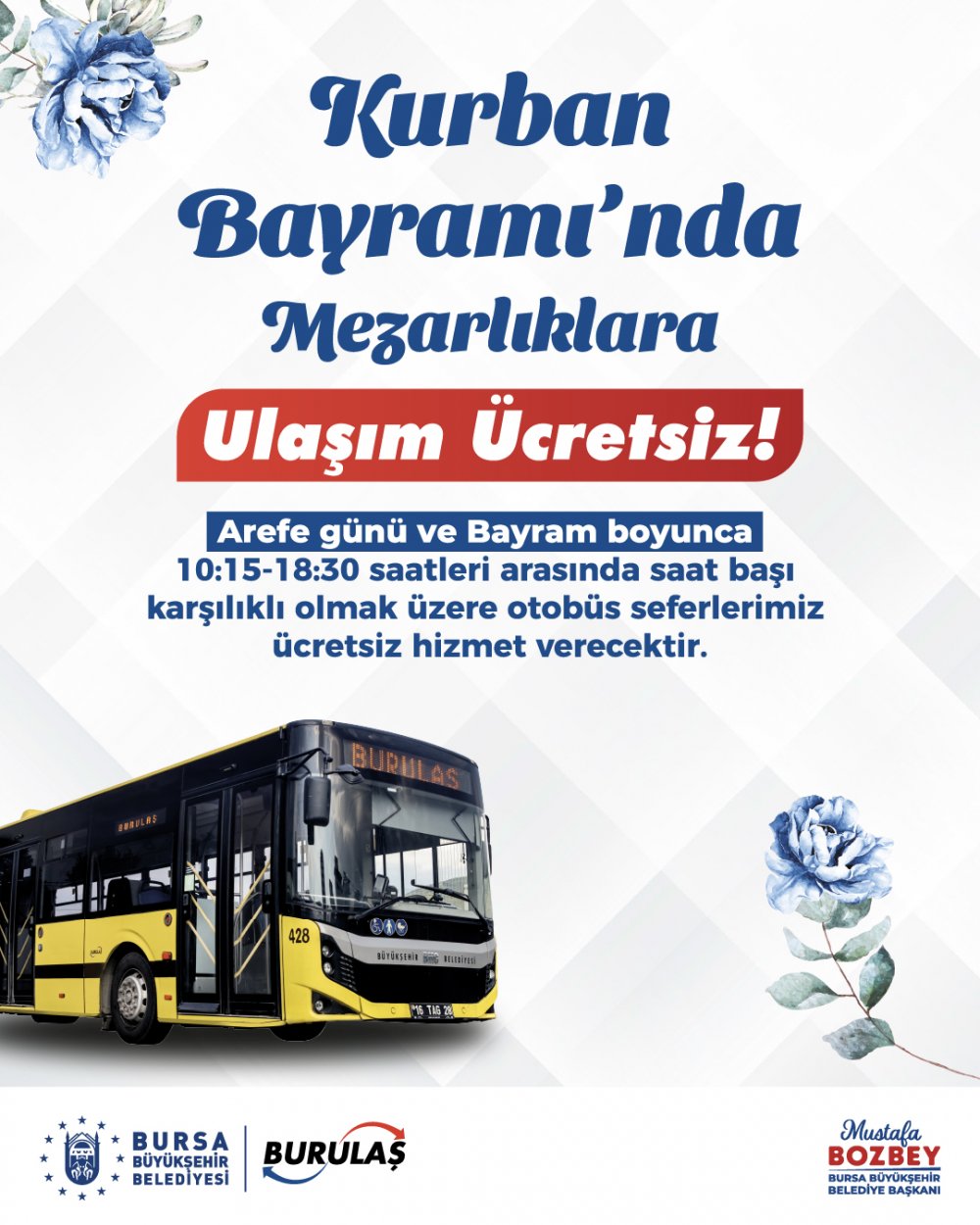 10:15 ile 18:30 saatleri arasında, saatte bir karşılıklı olarak yapılacak seferlerle vatandaşlar, Bursa'nın önemli mezarlıklarından olan Hamitler, Erdoğanköy ve Hasköy mezarlıklarına ücretsiz olarak taşınacak.