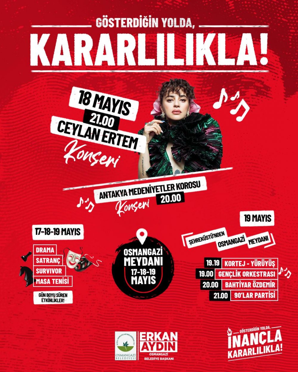 19 Mayıs coşkusu, 18 Mayıs Pazar akşamı Osmangazi Meydanı'nda verilecek iki muhteşem konserle zirveye çıkacak. Saat 20.00'da sahneye ilk olarak, Kahramanmaraş merkezli depremlerde kayıplar veren ancak müziğin birleştirici gücüyle ayakta duran Antakya Medeniyetler Korosu çıkacak. Koro, farklı yörelerden seslendireceği şarkı ve türkülerle izleyicilere duygusal ve unutulmaz anlar yaşatacak. Antakya Medeniyetler Korosu'nun ardından saat 21.00'da, kendine özgü sesi ve yorumuyla müzik dünyasında önemli bir yer edinen şarkı yazarı ve yorumcu Ceylan Ertem sahne alacak. Geniş bir izleyici kitlesine sahip olan Ertem, en sevilen şarkılarını Osmangazililer için seslendirecek.